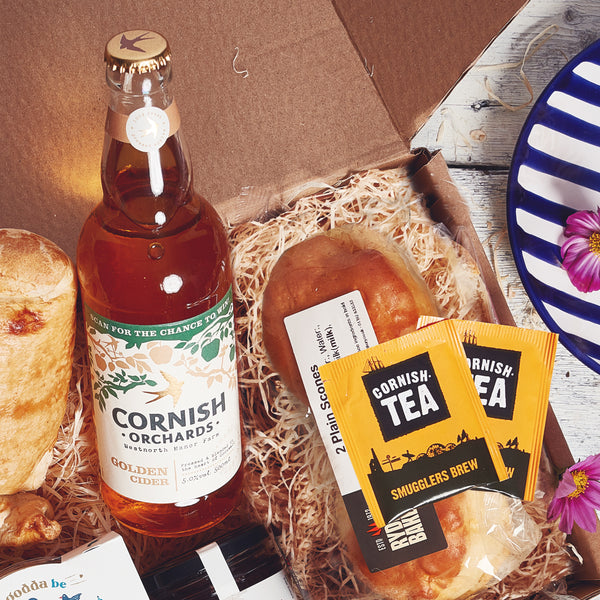 Pasty & Cider Cream Tea Hamper. Includes a hand-crimped pasty, a bottle of crisp, locally brewed cider and a traditional Cornish Cream Tea with two large scones.